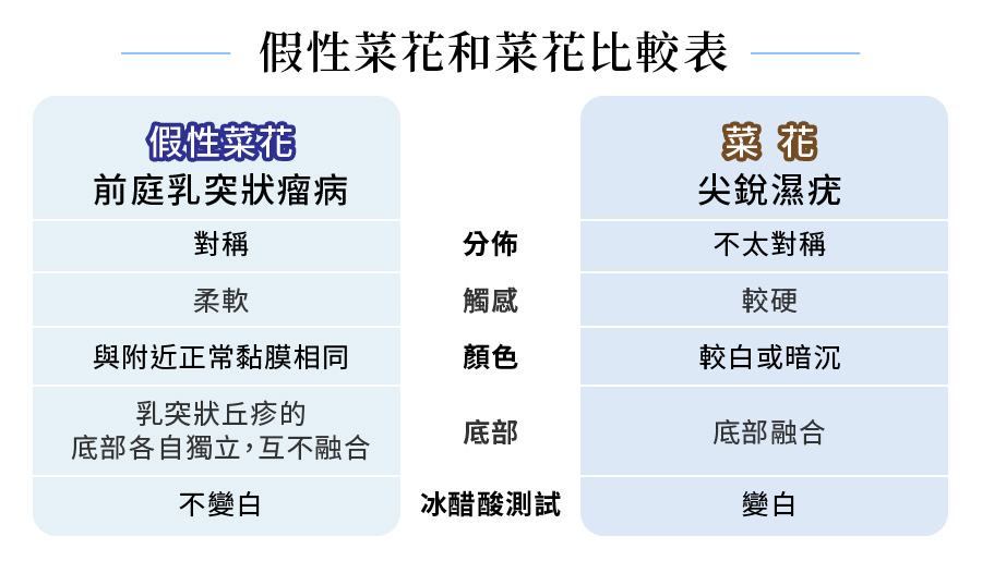 「前庭乳突狀瘤病』,俗稱「假性菜花」。它是一種陰部前庭黏膜解剖上的變異,但並不屬於性病,也不具傳染性,通常不需要進一步治療。