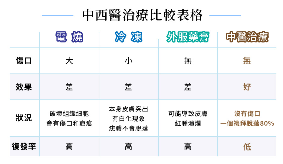 目前西醫主要以雷射電燒手術或二氧化氮冷凍等二種方式來去除表皮突出物,雖能暫時控制住外部生長,一旦患者抵抗力下降,病毒又會伺機復發。